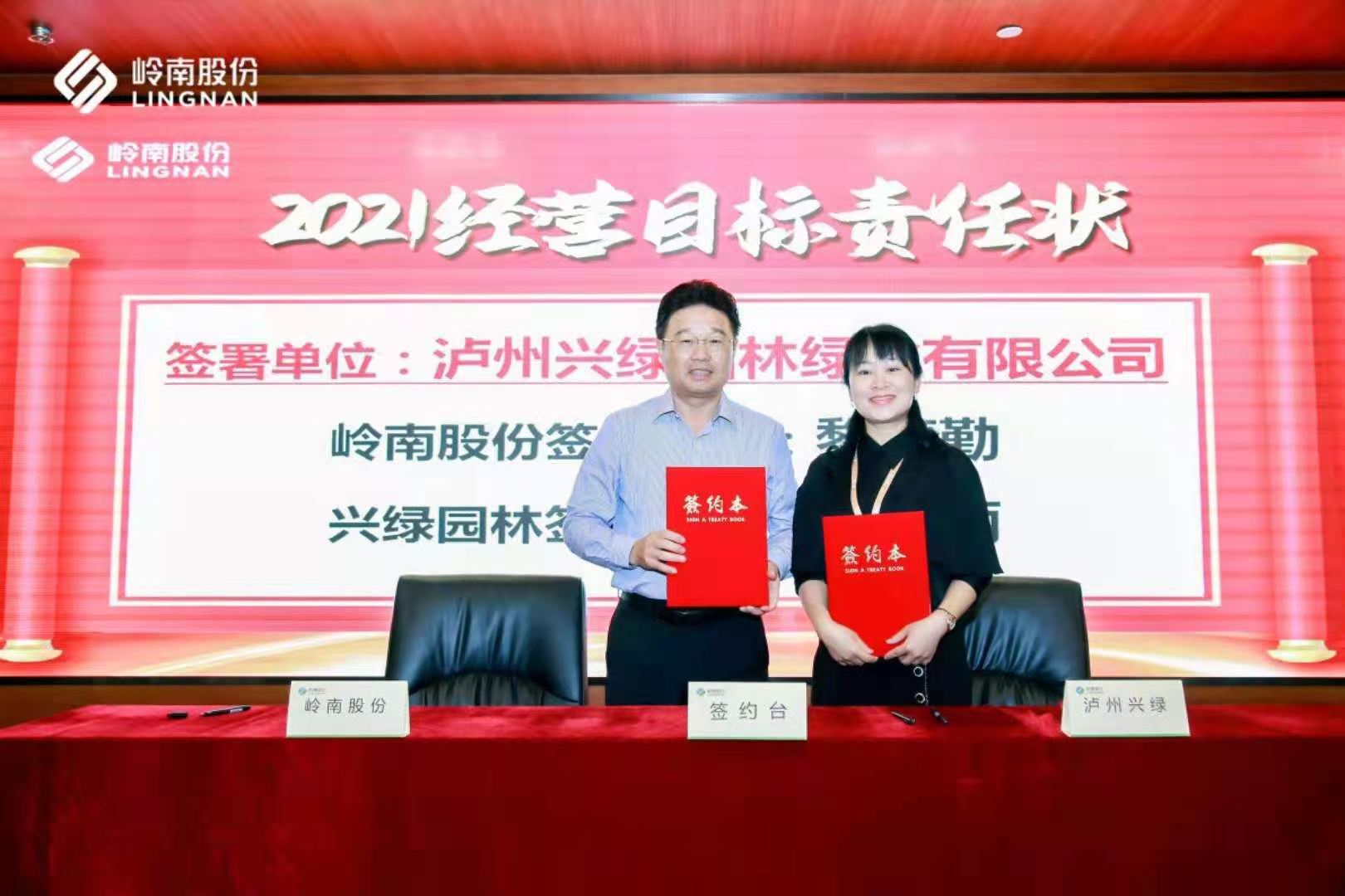 近日,嶺南生態(tài)文旅股份有限公司授予瀘州興綠園林綠化有限責任公司優(yōu)秀合作商稱號,并簽訂2021年經(jīng)營目標責任狀。