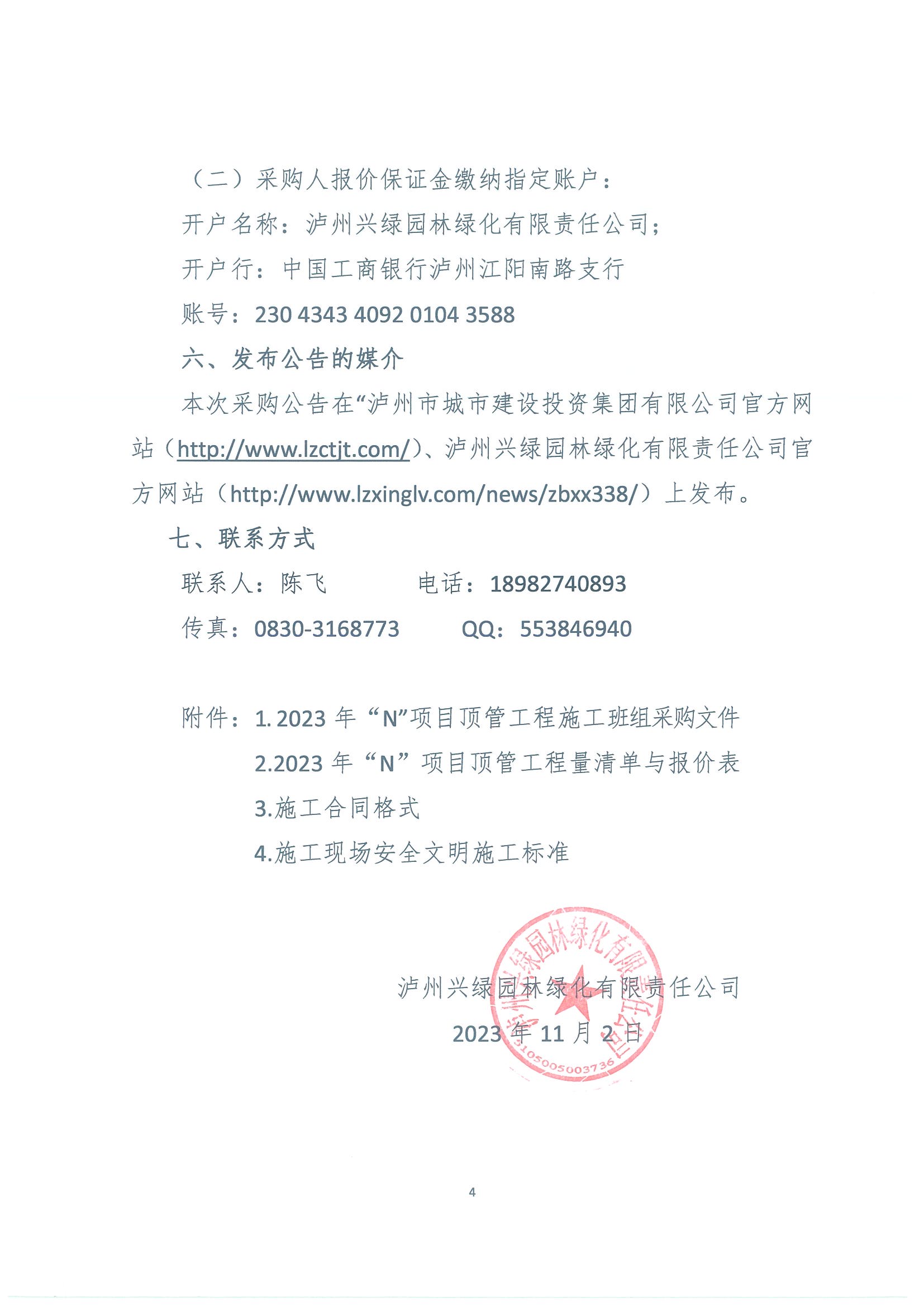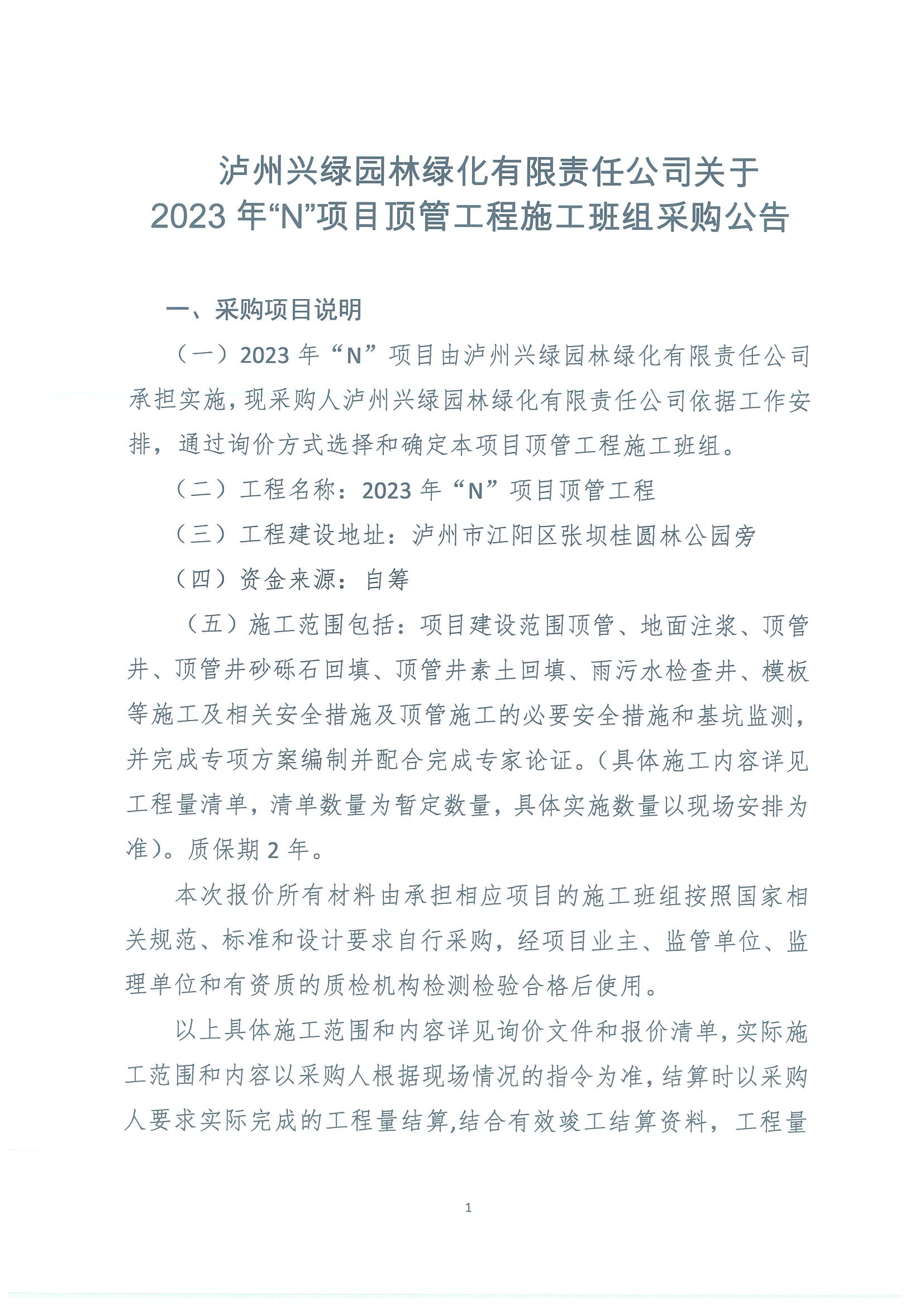 (一)2023年“N”項目由瀘州興綠園林綠化有限責任公司承擔實施,現(xiàn)采購人瀘州興綠園林綠化有限責任公司依據(jù)工作安排,通過詢價方式選擇和確定本項目頂管工程施工班組。
