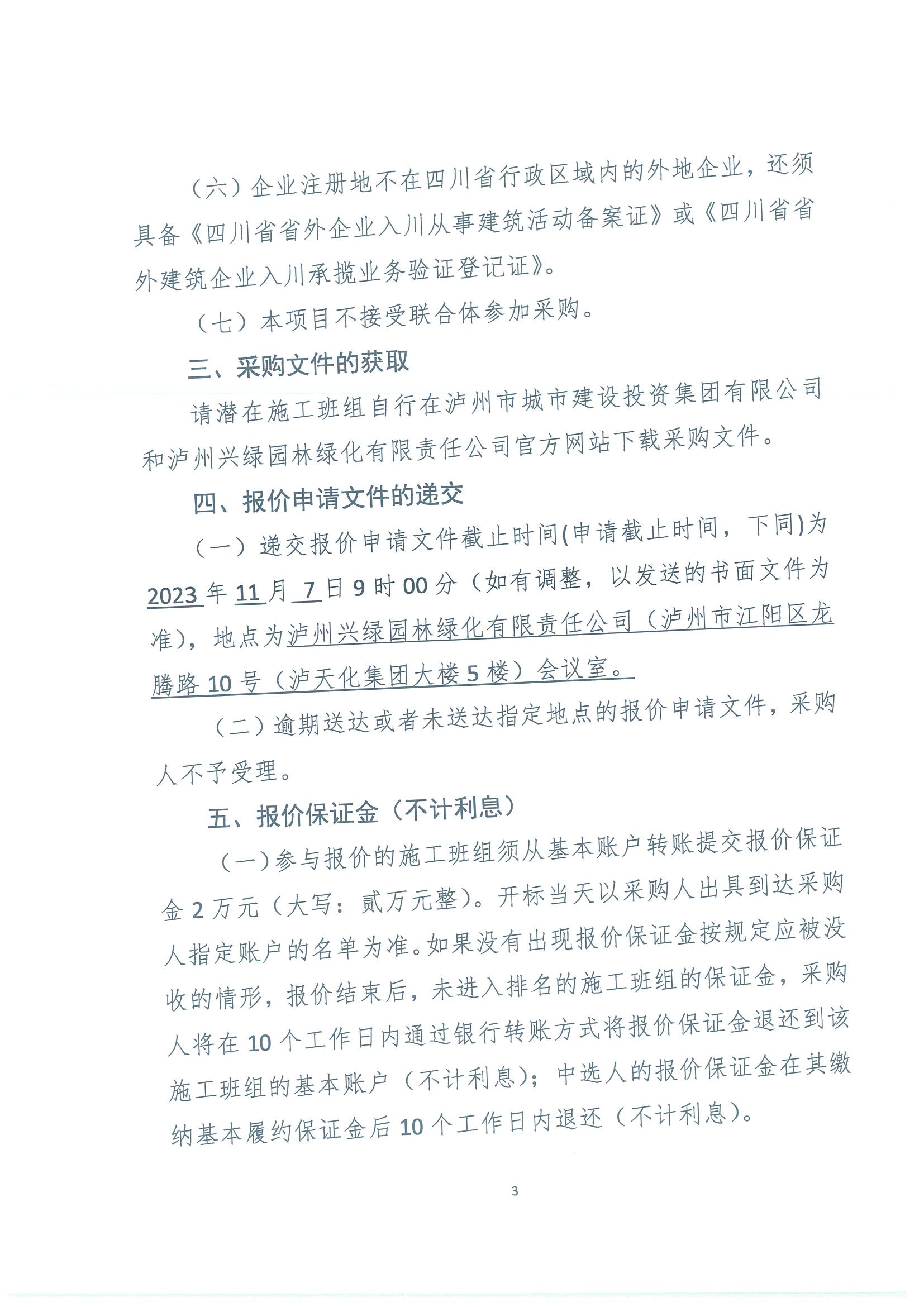 請潛在施工班組自行在瀘州市城市建設投資集團有限公司和瀘州興綠園林綠化有限責任公司官方網(wǎng)站下載采購文件。