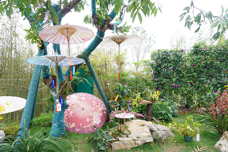 全園植物造景以雅致為特色,形態(tài)古樸,品種選取瀘州市花桂花、市樹桂圓,及曾唯一入選北京奧運(yùn)的荔枝品牌“帶綠”,還有蘭花、金釵石斛等體現(xiàn)瀘州特色,并通過綠植、奇石相互輝映講述瀘州的山石之美與豪邁熱情,還以瀘州非物質(zhì)文化遺產(chǎn)分水油紙傘為靈感設(shè)計(jì)創(chuàng)意構(gòu)筑,與新型光電技術(shù)互動光影屏相依而立,展現(xiàn)了古與今的對話,實(shí)與虛的結(jié)合,充分展示酒城工匠的作品與藝術(shù)造詣。